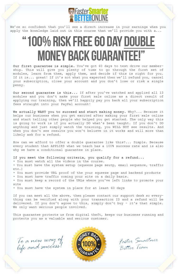 Yep seriously, we're 100% confident that our training is the very, very best you'll find online we want you to take a look inside the Faster Smarter Better members area right now. Come in for just $67 and kick the tires, get started, watch the first training module and finally start planning your financial freedom from a secure footing.