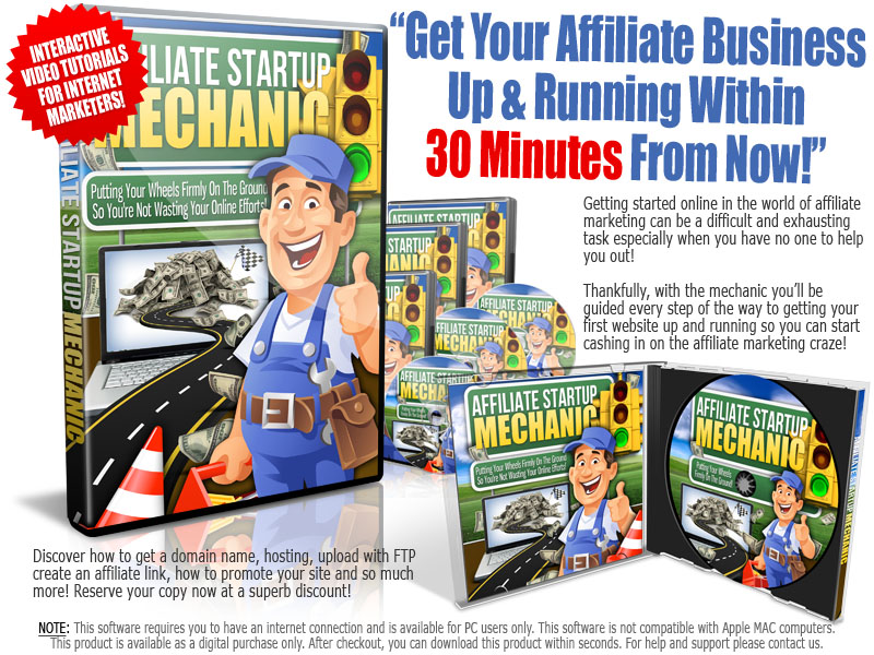 Take advantage of this wonderful opportunity to make money on the internet! If you're serious about setting up your own business and expect to sell frequently, then you simply CANNOT run a successful business without the knowledge found in Affiliate Startup Mechanic - just ask the pros (that's if they're not too busy to answer you because they're busy making money using the same system!)