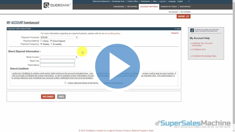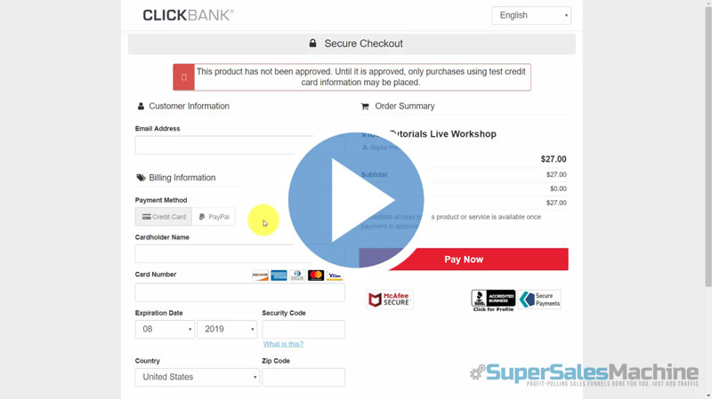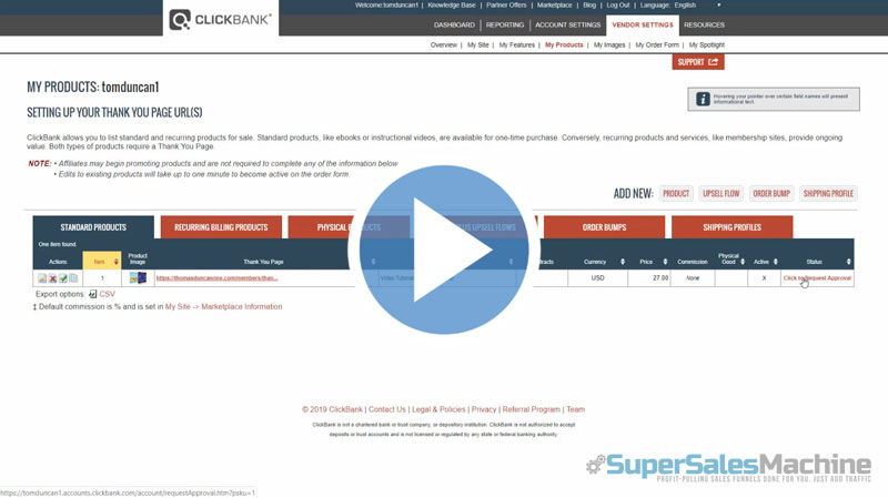 New ClickBank accounts with first product listings require a one-time small activation fee. Watch this video to see how it's done so you can get your product published live on the marketplace and make sales.