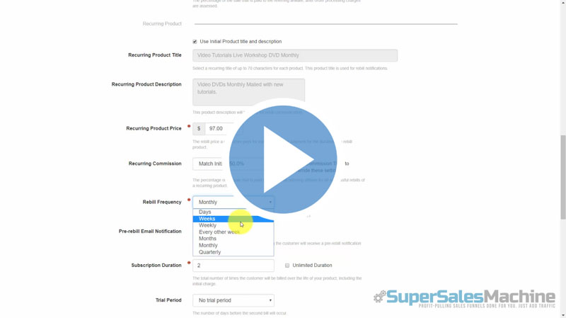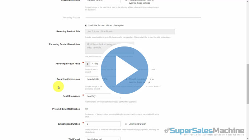 Continuing on from our last lesson we'll put the final touches on our custom product. We'll adjust the pricing, rebill frequency, duration and more for a customize product.