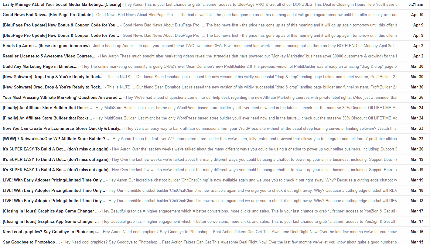 These emails will NEVER stop coming because those promotions make money... Money as an affiliate and money as a product creator ...and people never stop buying because these guys know how to write emails that sell.