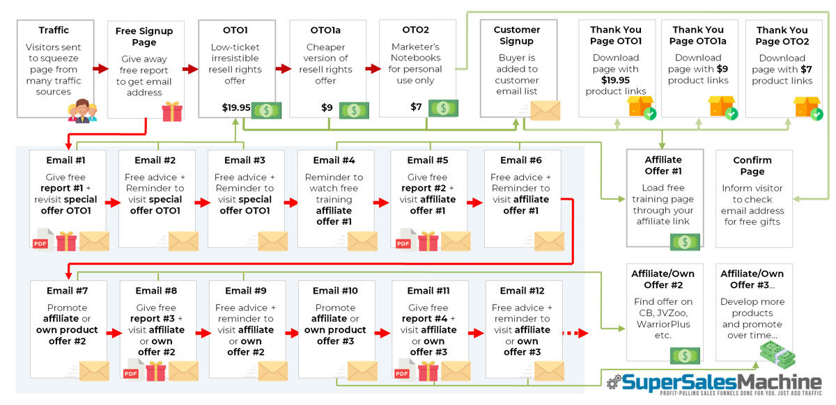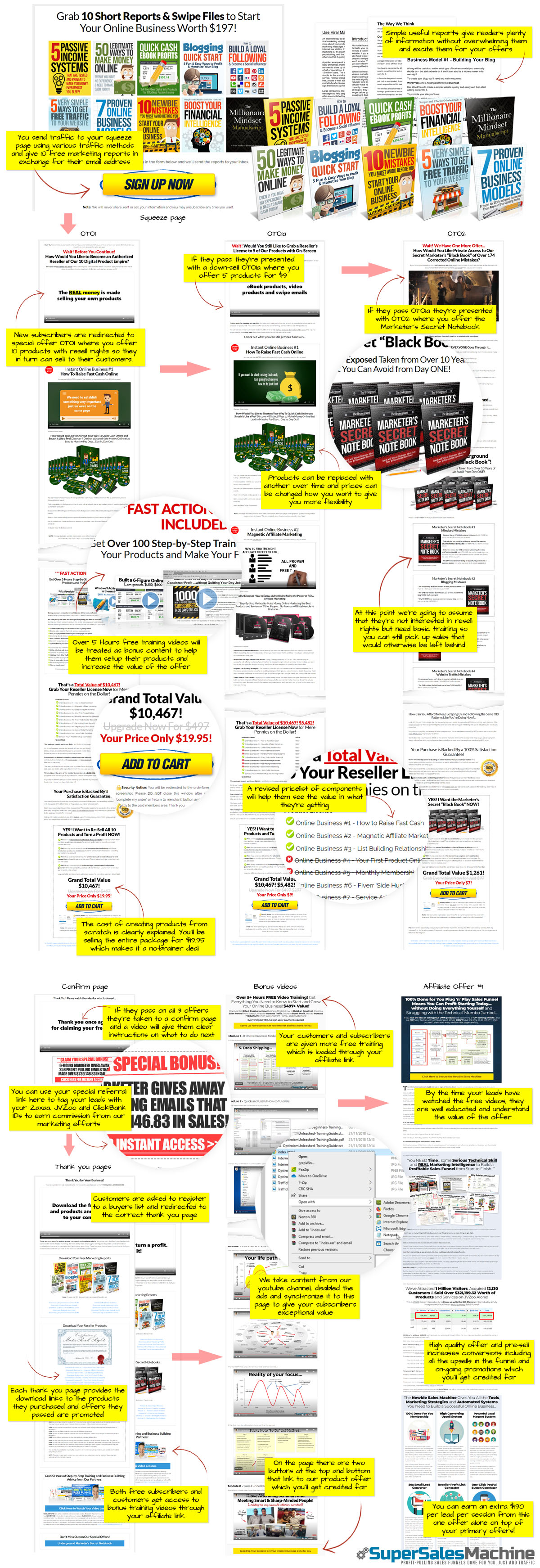 Everything in this funnel has it's purpose... from the type of reports you give away, to the type of customers you'll attract from the range of offers, to the verbiage used on the pass links, to the way the down-sell is presented, to the video instructions on what to do after signup, to guiding them through to the affiliate landing page, to the email campaign that reminds them to check out the special offers... and much more!