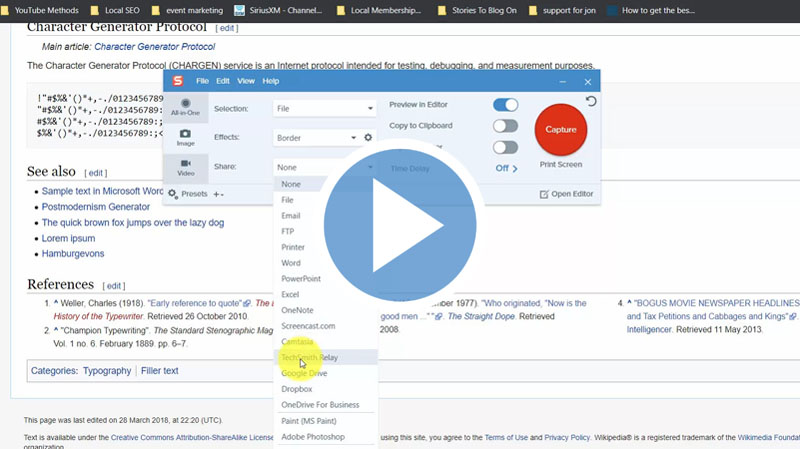 Snagit will allow you to share your content to any of the existing TechSmith programs. In this video, we'll show you how to share your content to Screencast.com, TechSmith Relay, Camtasia, etc.