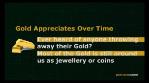 Gold appreciates over time. Remember how Gold is indestructible and there’s practically no wastage of Gold that is taking place. Ask yourself, ever heard of anyone throwing away their Gold? Not me. Most of the Gold around us such as jewellery or coins are either sitting in reserves of central banks, or in your neighbors’ vault.
