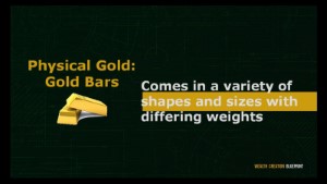 Another Physical Gold investment is through Gold Bars. It comes in a variety of shapes and sizes. What’s more, buying Gold Bars in bulk saves a lot of money compared to Gold Coins. It is also available in multiple weight, from 1 ounce to 100 and 400 troy ounces.