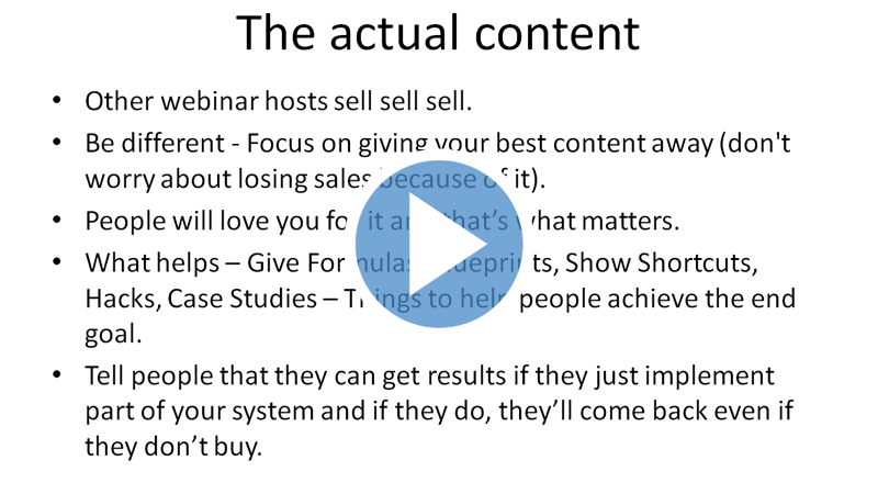 In this part of the sales webinar blueprints, we will be covering how you can convey the content or meaty part of your webinar. There is more to this section than just simply blurting out why your product/service is worth buying. So we will be showing you specific strategies that you can use to really get people interested in your product or service or business.